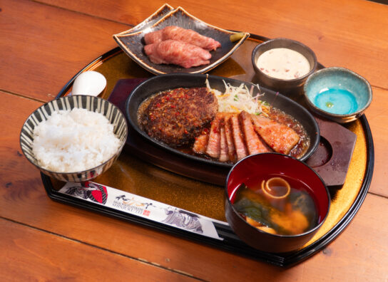The set meal includes steamed white rice, A5-grade wagyu steak 100g , two pieces of wagyu beef sushi, miso soup, fresh salad, and a flavorful house-made sauce.
